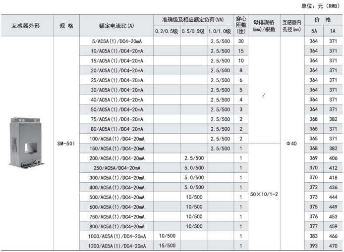 技術要求:額定電流比500A/5A/20mA;準確級0.5/0.2級;穿心匝數1匝;內孔徑φ40mm。