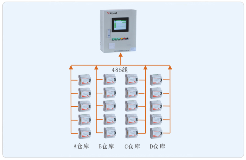 系統(tǒng)采用安科瑞消防電源監(jiān)控系統(tǒng),該系統(tǒng)主要采用分層分布式網(wǎng)絡(luò)結(jié)構(gòu),系統(tǒng)結(jié)構(gòu)為:站控管理層、網(wǎng)絡(luò)通訊層和現(xiàn)場(chǎng)設(shè)備層。其中廣陳第三方電子商務(wù)平臺(tái)托管產(chǎn)業(yè)基地現(xiàn)場(chǎng)設(shè)備分布為A、B、C、D倉庫以及綜合辦公用房消防配電回路。該系統(tǒng)監(jiān)控所有消防配電柜內(nèi)消防回路雙電源的實(shí)時(shí)運(yùn)行狀態(tài),如有異常會(huì)后臺(tái)報(bào)警。所有監(jiān)測(cè)模塊通過485總線鋪設(shè)至消防控制室,消防電源監(jiān)控主機(jī)從而完成對(duì)監(jiān)測(cè)模塊的采集并監(jiān)控。