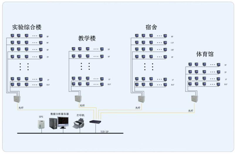 安科瑞Acrel-5000建筑能耗分析管理系統(tǒng)根據(jù)上海復(fù)旦中學(xué)西部校區(qū)現(xiàn)場實際情況,整體網(wǎng)絡(luò)結(jié)構(gòu)采用屏蔽雙絞線直接接至樓層弱電井的數(shù)據(jù)采集器然后通過光纖將數(shù)據(jù)上傳至的監(jiān)控主機(jī)。該系統(tǒng)主要采用分層分布式計算機(jī)網(wǎng)絡(luò)結(jié)構(gòu),站控管理層、網(wǎng)絡(luò)通訊層和現(xiàn)場設(shè)備層。