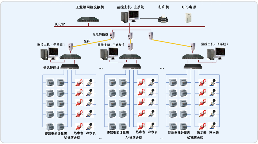 重慶廣達生活服務(wù)區(qū)能耗監(jiān)測系統(tǒng)采用網(wǎng)絡(luò)分布式結(jié)構(gòu),整個系統(tǒng)包括該建筑群的七個子系統(tǒng)和中心監(jiān)控室的一個總監(jiān)控系統(tǒng)。冷/熱水表數(shù)據(jù)和電表數(shù)據(jù)當?shù)夭杉瓿珊蠹袀髦林行谋O(jiān)控室。 分控中心和中心監(jiān)控室之間用光纖網(wǎng)絡(luò)進行通訊。每個子系統(tǒng)采用五臺通訊管理機,其中三臺通訊管理機采集樓內(nèi)每戶的冷/熱水表數(shù)據(jù),另外兩臺采集樓內(nèi)電表的數(shù)據(jù)。