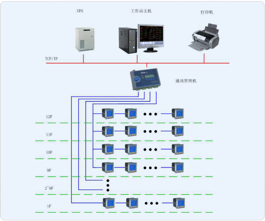整個大樓采用兩路獨立的10KV高壓進線,經(jīng)地下室10/0.4KV變配電所后供電,供電工作電壓為三相五線 380/220V。本工程地下室設置10/0.4KV變配電所,在樓層配電箱設分項計量,共48路計量節(jié)點,包括照明、插座、空調(diào)等,具體建設目標如下: