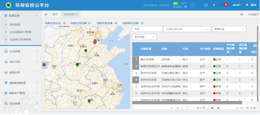 設備狀態分析:統計分企業某個時間段內的產污設備運行、停機,監測設備失聯,可以查看實時上報的數值。